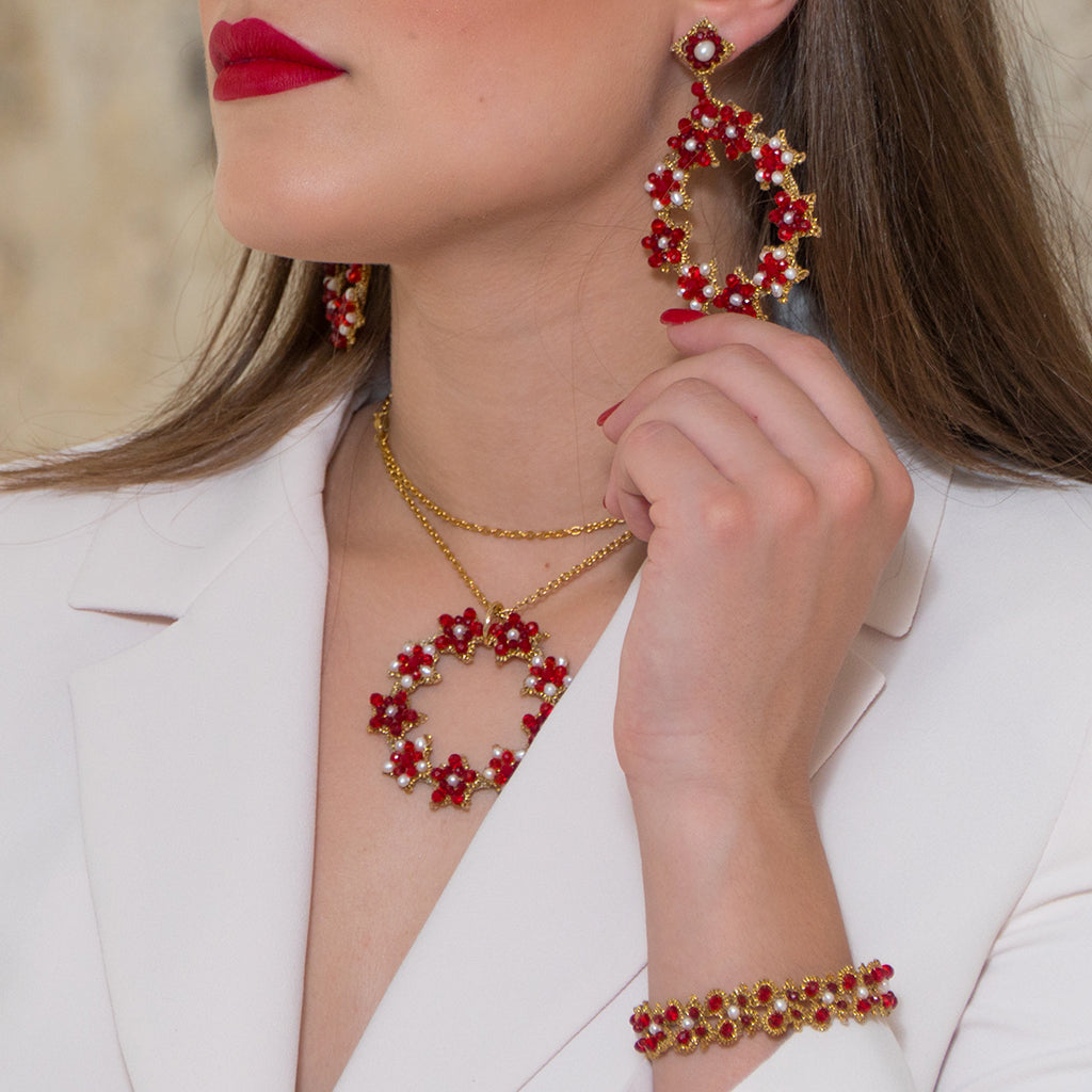 Our painstaking craftwomen, dedicate hours and sacrifice in refining the technique through the search of natural stones and crystals that create fascinating and universal contrasts and high quality yarns whose bows leaves and ‘ pippiolini’ combined give rise to unique geometric figures and hard to imitate in equal measure, where even the small imperfections, specific to the craftsmanship , make every jewels authentic.